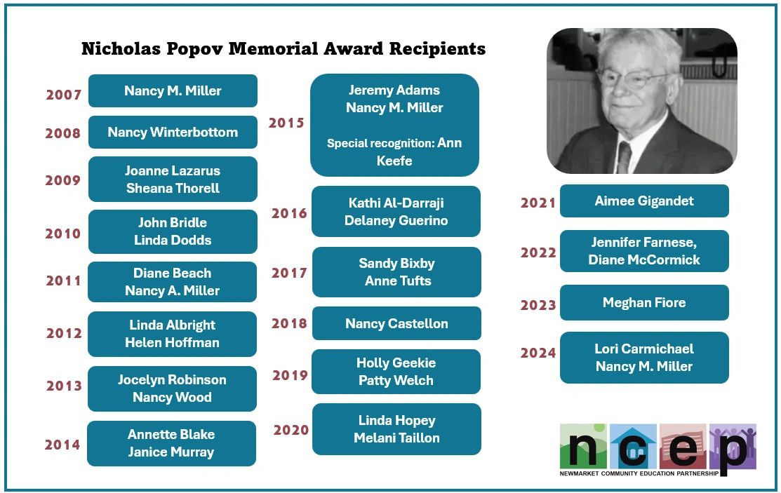 NCEP invites Newmarket Jr./Sr. High School staff members to nominate individuals they feel best deserve the 2025 Nicholas Popov Memorial award. The nominating process is easy! Simply complete the application below by Friday May 16, 2025.